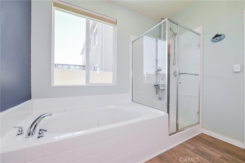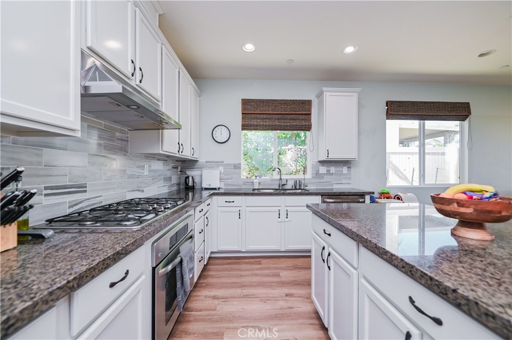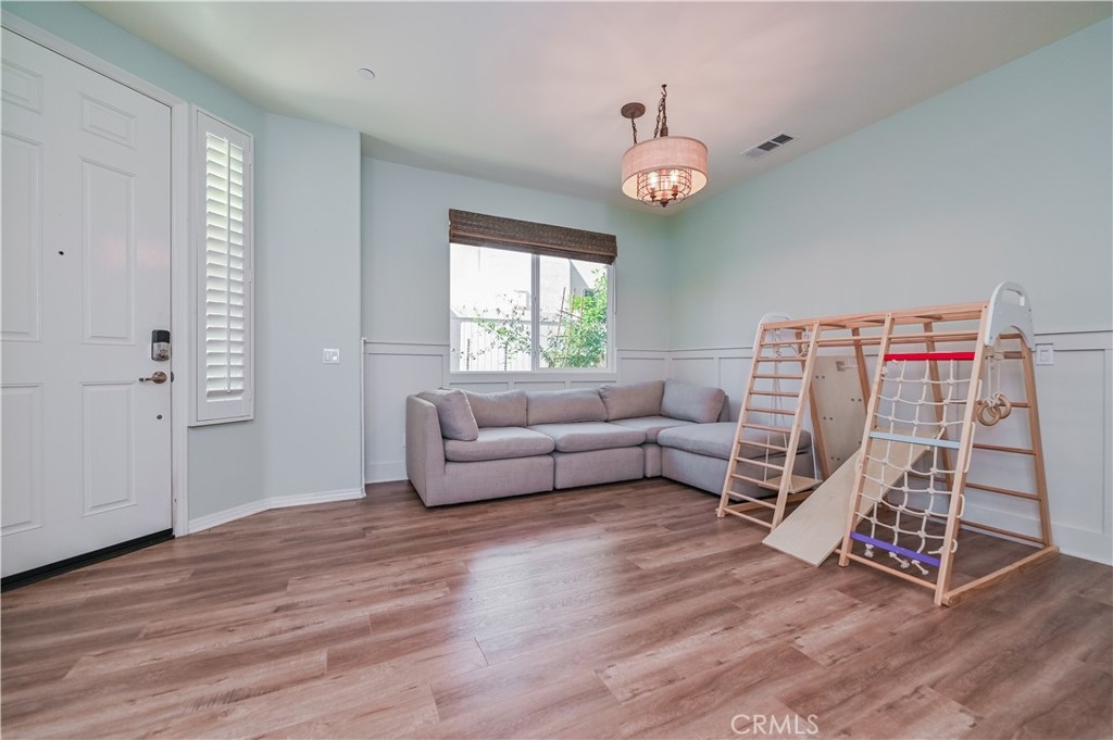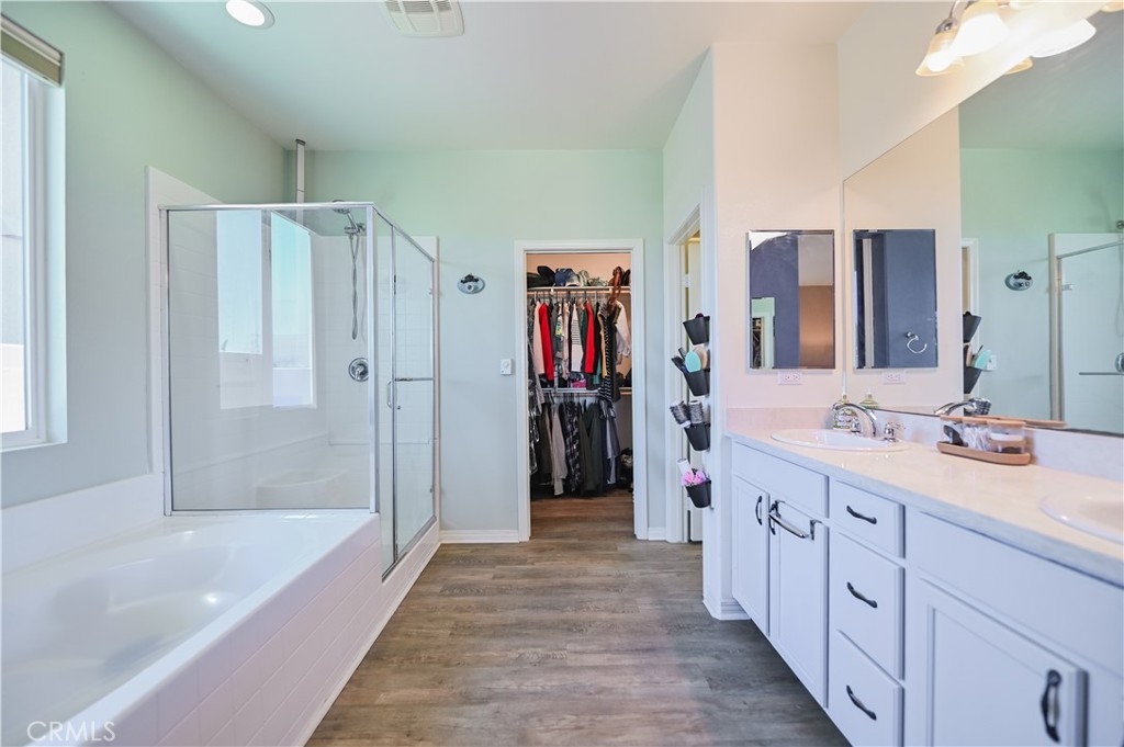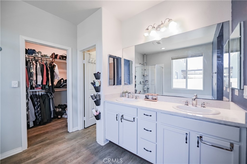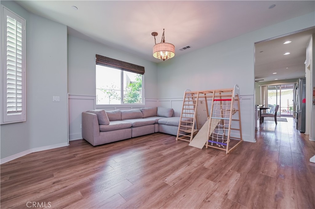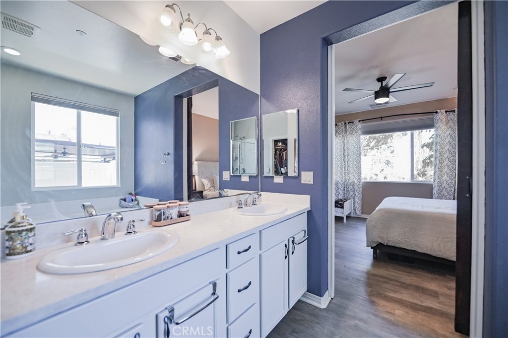 This 2013 Impeccable Cul-De-Sac Home offers an Open Floor-plan, Custom Painted Walls, Floors through the House ,Plantation Shutter, Roman Shade,Water Filter & Custom-Made Garden with automatic sprinkler . The floor-plan strategy support enough daylighting. Through the front yard, semi-enclosed vestibule lead to the home.A formal Living Room features a molding wall design. The Kitchen is open and boasts granite counter tops, a large island, stainless steel appliances, recessed lighting, a wet bar and a LARGE walk-in pantry .A Dining area connect Kitchen and Family room.A large Family-Room with a Stone Fireplace and Sliding Doors to a Private Landscaped Backyard Garden. The spacious Primary Suite with its big Windows dressed with Roman Shades and Beautiful designed garden VIEW. A Wood barn Door lead to Primary Bath with dual Sinks , separate Shower & Tub, a Toilet Room and ample Walk-in Closet. Indoor Laundry-Room with Upper-Cabinets.The 2 Car garage upgraded with 2 Overhead Steel Storage Racks.