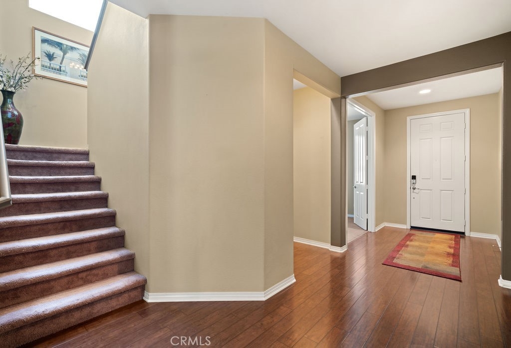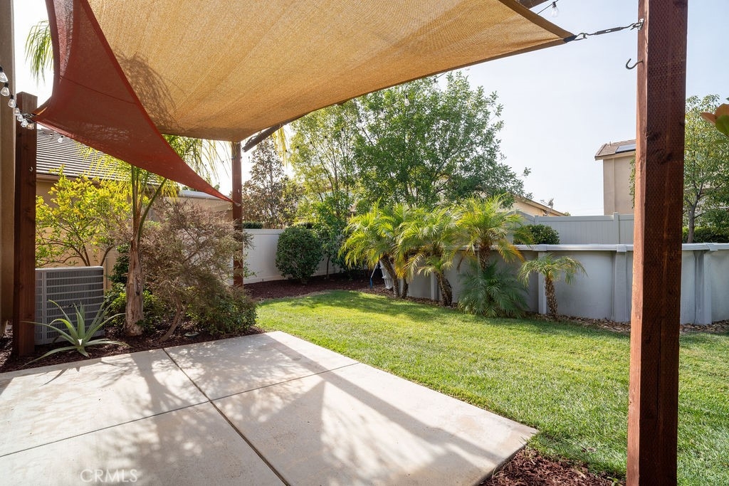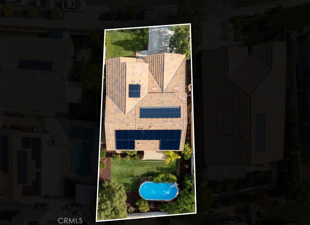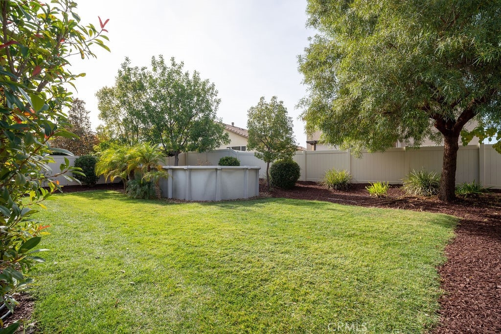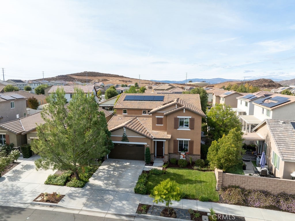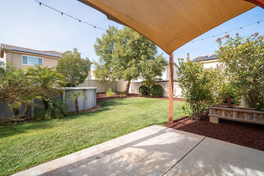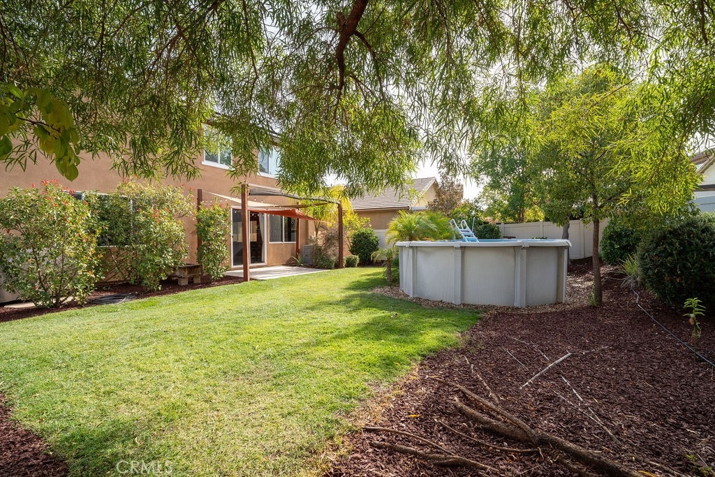 Charming above-ground pool home with beautiful curb appeal in the desirable community of Rancho Bella Vista with PAID OFF SOLAR PANELS! This 5 bedroom home is energy efficient with a newer tankless water heater, water filtration, water softener and reverse osmosis system along with 26 completely paid off solar panels (8 installed in 2013 and 18 installed in 2023 and just recently professionally cleaned in November 2024). Enjoy an open floorplan with a spacious living room and cozy fireplace with ample dining space and kitchen island for additional casual dining. The kitchen offers a giant island, stone backsplash with granite counters and many cabinets for storage along with a walk-in pantry, pendant lighting and a newer dishwasher. Lovely views out to the mature backyard with an above-ground pool, shade-sail patio area, palm trees, and multiple fruit trees including meyer lemon, lime, plum, peach, grapes, avocado and tangerine. Upstairs there's a mini loft which could be perfect for a computer nook, den, movie room, or play area along with 3 additional guest bedrooms, large laundry room with built-in cabinets and shelving and the primary suite. The primary bedroom is massive and the bathroom has dual sinks with granite counters, tile flooring, soaking tub, custom shelving, and an enormous walk-in closet with multiple rods and ample storage space. The garage floor has been epoxied and offers extra space for additional storage along with storage under the staircase as well. There are multiple highly-rated Temecula USD schools within walking distance for convenience and this quiet community has a very low HOA. This is a wonderful opportunity to own a very efficient and move-in ready home to make your own!